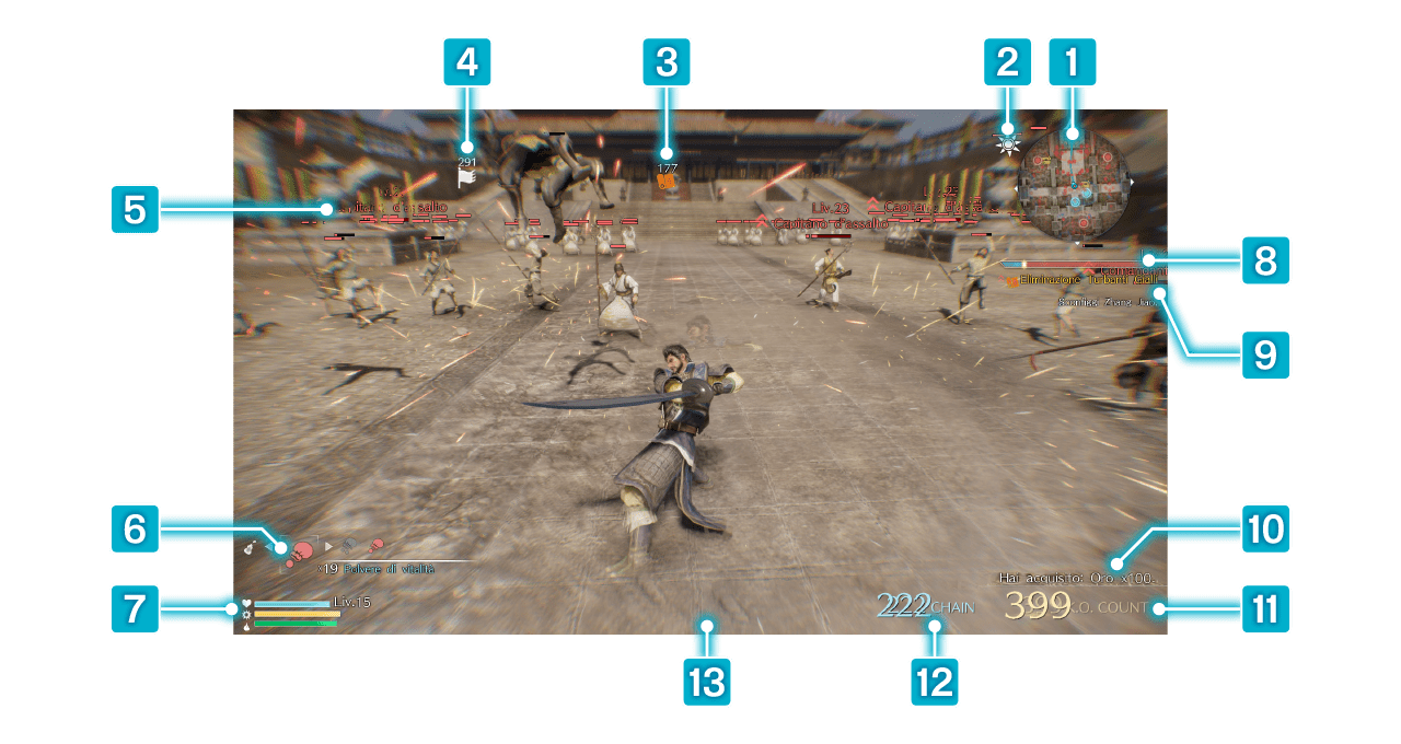 Quando questa barra è completa, puoi eseguire l'Attacco Musou. Questa barra si ricarica quando infliggi danni ai nemici, ma anche quando li subisci. |