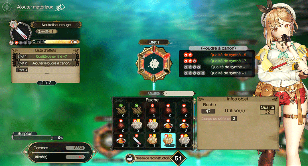 Les objets finis peuvent être encore améliorés via la reconstruction d'objet. Cela nécessite des gemmes, pouvant s'obtenir en réduisant des objets.