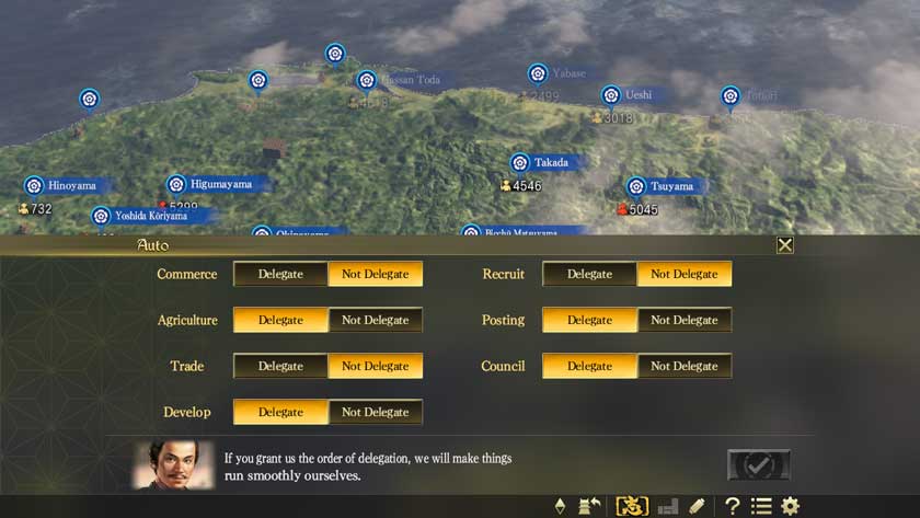 Select which commands to leave to the computer, out of Commerce, Agriculture, Trade, Develop, Recruit, Posting, and Council.