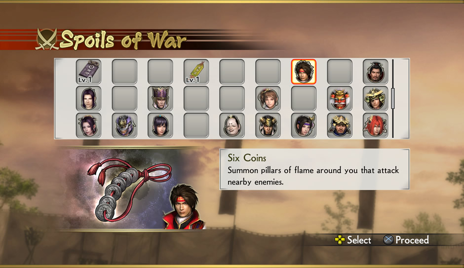 The portable item system from "SAMURAI WARRIORS 3" returns for this title. You can customize your items to each stage or difficulty level by choosing ones that focus on the area of your greatest need. Load up on Health boost items for a particularly difficult stage, or use those that boost your Attack strength for a stage you need to clear quickly.